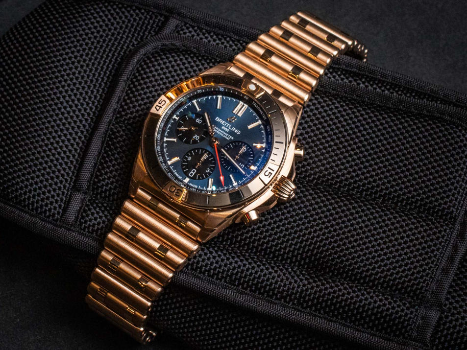 Between the inherently chunky design of the Chronomat’s case and its generous use of 18k rose gold, the high quality duplicate Breitling Chronomat B01 42 Super Bowl LVIII Edition watches offers a rather hefty presence on the wrist, and just the head of the watch weighs approximately 140 grams all by itself, before you even factor in any type of strap or bracelet. Buyers of the Chronomat B01 42 Super Bowl LVIII Edition have the option of getting it on either a black rubber strap with a rose gold deployant buckle, or a full 18k red gold version of the Chronomat’s signature Rouleaux bracelet. Unlike the standard-production 42mm Chronomat watches, the Chronomat B01 42 Super Bowl LVIII Edition comes with the textured style of rubber strap, which mirrors the appearance of the Rouleaux bracelet links and can typically only be found on the 44mm Chronomat models. Additionally, while the rubber strap is certainly the lighter option, the solid gold Rouleaux bracelet is undeniably quite special on the wrist, and it offers a surprisingly thin and elegant design, as it tapers from 22mm at the lugs down to 20mm where it connects to its signed butterfly-style folding clasp.