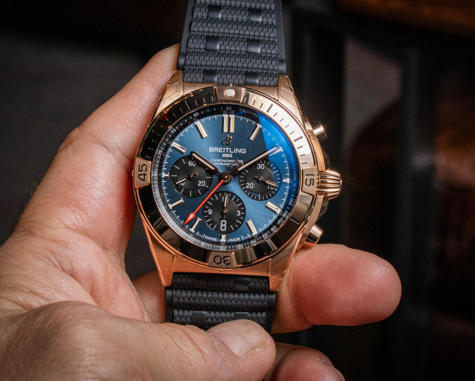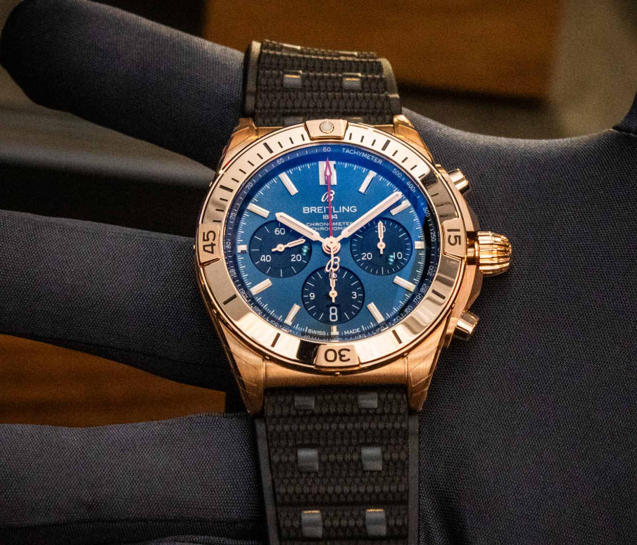 Between the inherently chunky design of the Chronomat’s case and its generous use of 18k rose gold, the high quality duplicate Breitling Chronomat B01 42 Super Bowl LVIII Edition watches offers a rather hefty presence on the wrist, and just the head of the watch weighs approximately 140 grams all by itself, before you even factor in any type of strap or bracelet. Buyers of the Chronomat B01 42 Super Bowl LVIII Edition have the option of getting it on either a black rubber strap with a rose gold deployant buckle, or a full 18k red gold version of the Chronomat’s signature Rouleaux bracelet. Unlike the standard-production 42mm Chronomat watches, the Chronomat B01 42 Super Bowl LVIII Edition comes with the textured style of rubber strap, which mirrors the appearance of the Rouleaux bracelet links and can typically only be found on the 44mm Chronomat models. Additionally, while the rubber strap is certainly the lighter option, the solid gold Rouleaux bracelet is undeniably quite special on the wrist, and it offers a surprisingly thin and elegant design, as it tapers from 22mm at the lugs down to 20mm where it connects to its signed butterfly-style folding clasp.