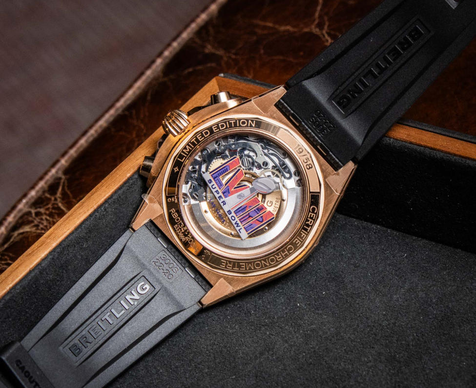 Generally speaking, I’m not really a fan of display casebacks that have logos or graphics printed on them, although I recognize that it is often the most straightforward way of navigating the complex world of co-branding and licensing agreements. Whenever a brand just prints its own logo on the underside surface of the display window, I almost always feel that it could have been omitted entirely, as a custom rotor or nicely engraved caseback is a much more elegant way of adorning the reverse side of a watch. On Breitling’s standard-catalog models, the brand simply opts for a traditional clear display window to offer an unobstructed view of the internal movement, and this is ultimately my preferred style of caseback for most high-end timepieces. However, given that the best clone Breitling Chronomat B01 42 Super Bowl LVIII Edition watches is an official product that has been blessed by the NFL, having the actual Super Bowl LVIII logo on the watch is a rather important detail, and this means the red, gray, and purple emblem was going to need to appear somewhere on this limited-edition timepiece. Personally, I feel that putting the logo on the caseback is a far more tasteful implementation versus having it printed on the dial, as the later method can often create a “gift shop memorabilia” vibe, even when the size of the logo is modest and its placement is carefully considered.